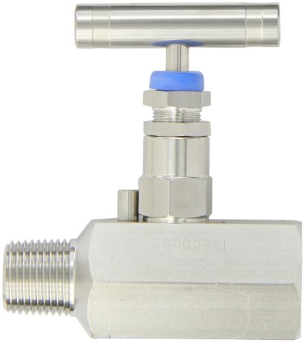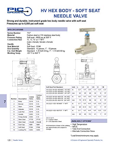 PIC Gauge HV-SS-1/2-GS-180-MXF 316 Stainless Steel Hex Body Straight Needle Valve with Gas Service Seat, 1/2″ Male NPT x 1/2″ Female NPT Connection Size, 6,000 psi Pressure